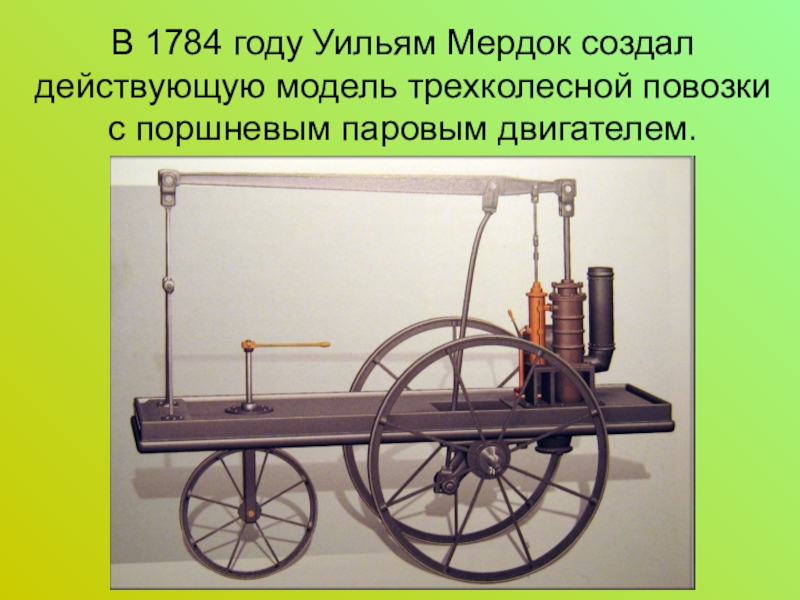 В 1784 году Уильям Мердок создал действующую модель трехколесной повозки с поршневым паровым двигателем.