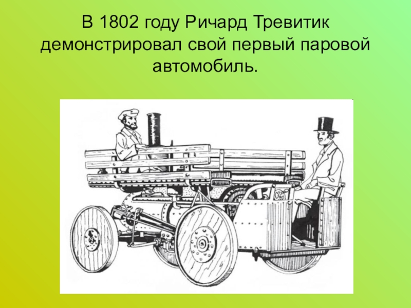 Слайд 22В 1802 году Ричард Тревитик демонстрировал свой первый паровой автомобиль.