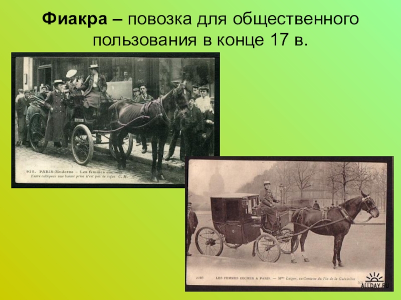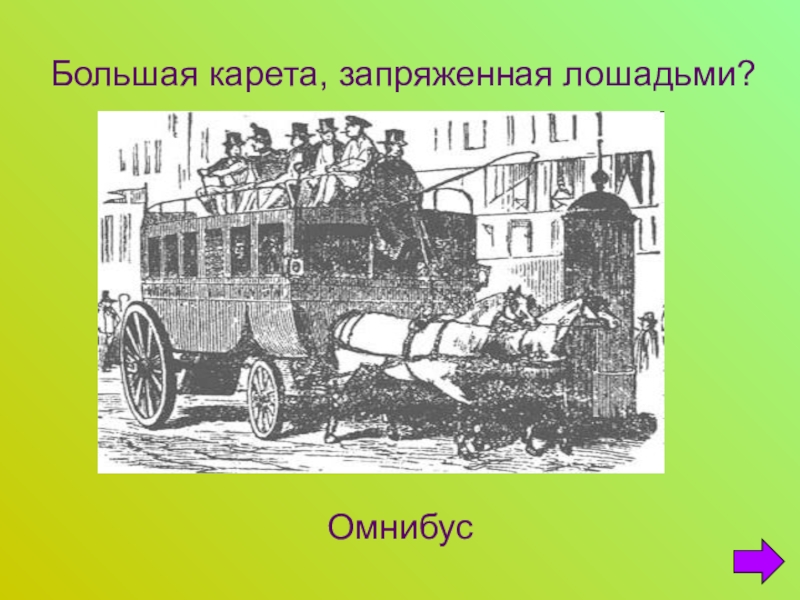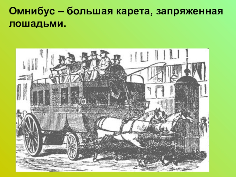 Слайд 15Омнибус – большая карета, запряженная лошадьми.