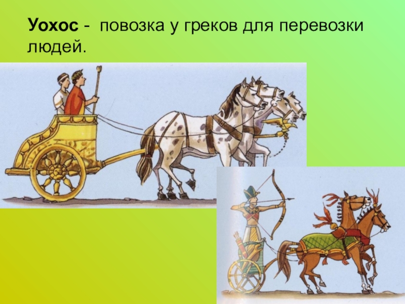 Слайд 8Уохос - повозка у греков для перевозки людей.