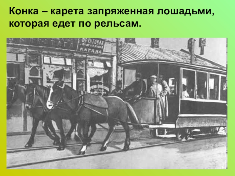 Слайд 16Конка – карета запряженная лошадьми, которая едет по рельсам.