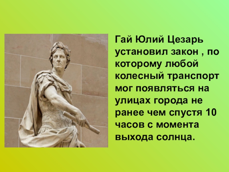 Слайд 13Гай Юлий Цезарь установил закон , по которому любой колесный транспорт