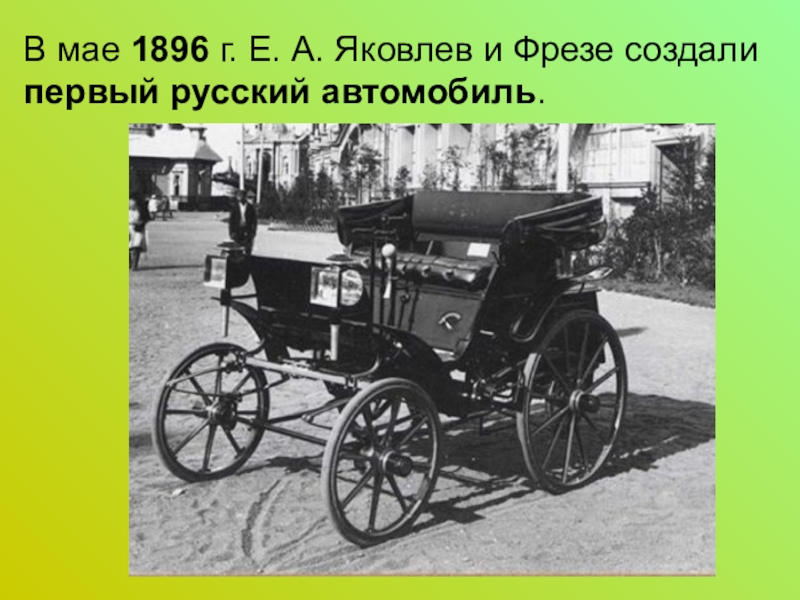 В мае 1896 г. Е. А. Яковлев и Фрезе создали первый русский автомобиль.