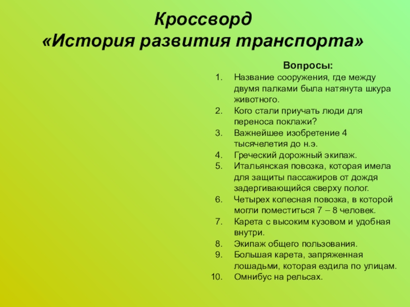 Кроссворд«История развития транспорта»Вопросы:Название сооружения, где между двумя палками была натянута шкура животного.Кого стали приучать люди для переноса