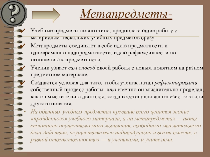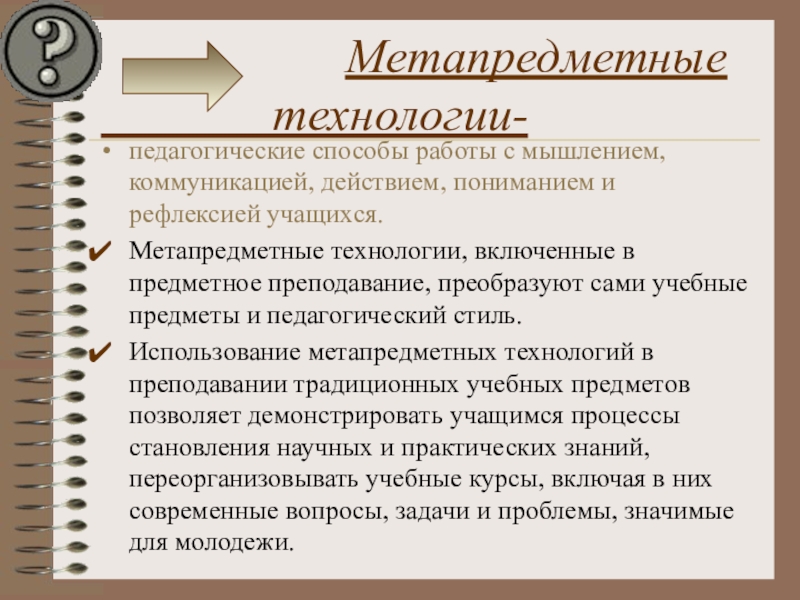 Метапредметные технологии, включенные в предметное преподавание, преобразуют сами учебные предметы и педагогический стиль.