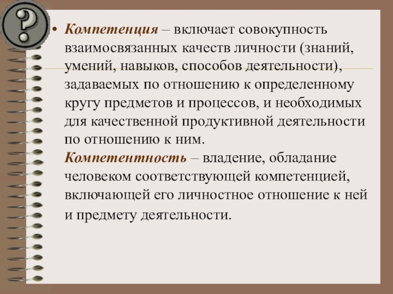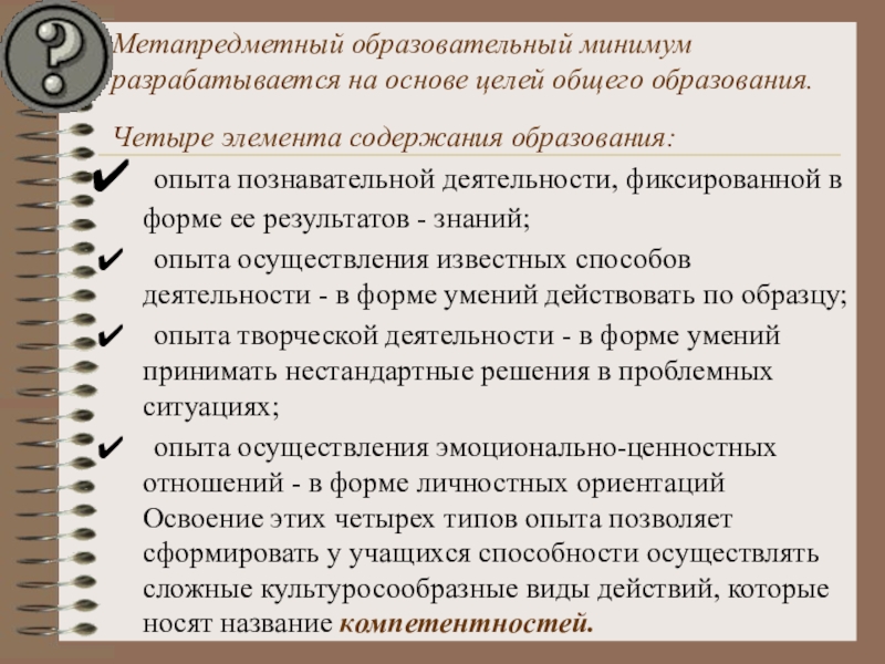 опыта осуществления эмоционально-ценностных отношений - в форме личностных ориентаций Освоение этих четырех типов опыта позволяет сформировать у учащихся способности осуществлять сложные культуросообразные виды действий, которые носят название компетентностей.