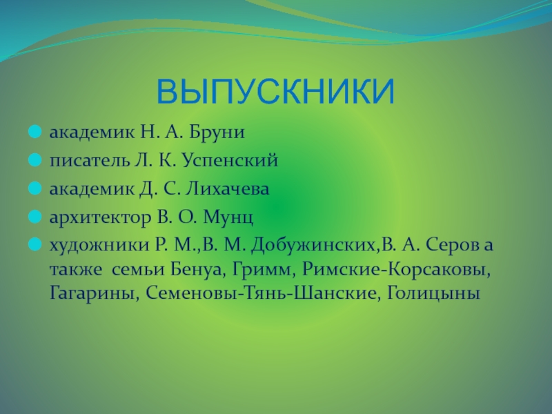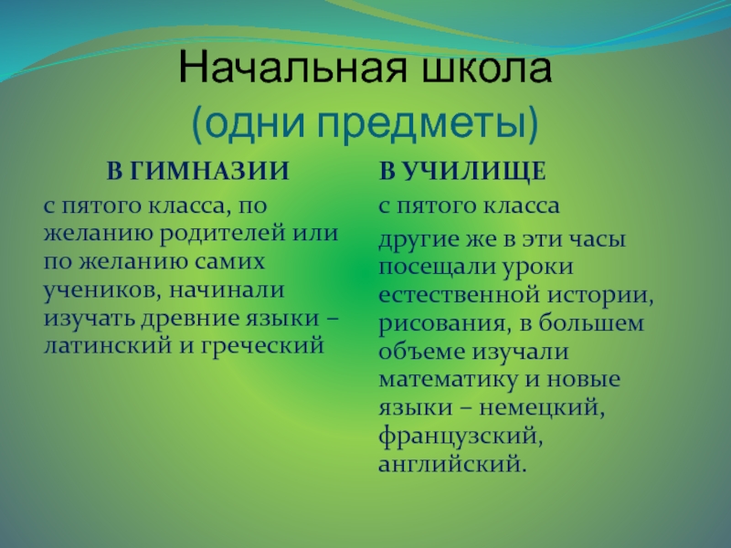 другие же в эти часы посещали уроки естественной истории, рисования, в большем объеме изучали математику и новые языки – немецкий, французский, английский.