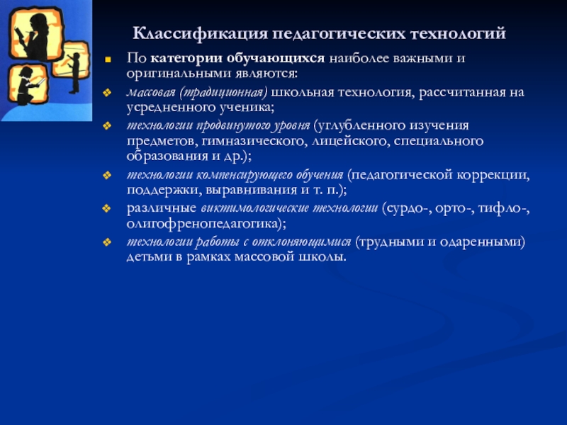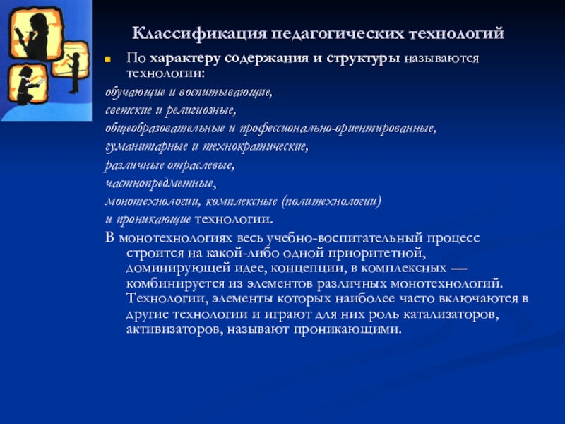 В монотехнологиях весь учебно-воспитательный процесс строится на какой-либо одной приоритетной, доминирующей идее, концепции, в комплексных — комбинируется из элементов различных монотехнологий. Технологии, элементы которых наиболее часто включаются в другие технологии и играют для них роль катализаторов, активизаторов, называют проникающими.
