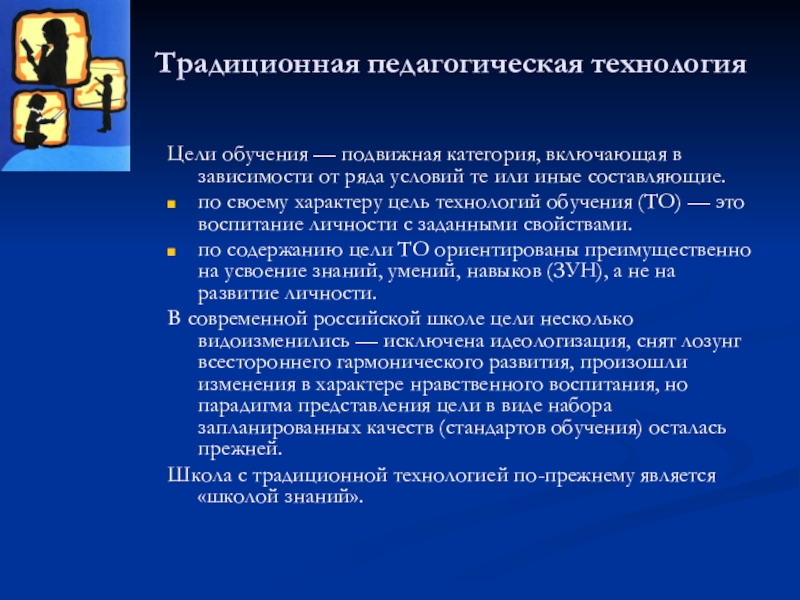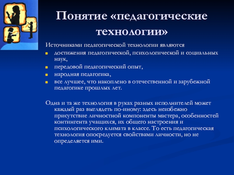 Одна и та же технология в руках разных исполнителей может каждый раз выглядеть по-иному: здесь неизбежно присутствие личностной компоненты мастера, особенностей контингента учащихся, их общего настроения и психологического климата в классе. То есть педагогическая технология опосредуется свойствами личности, но не определяется ими.