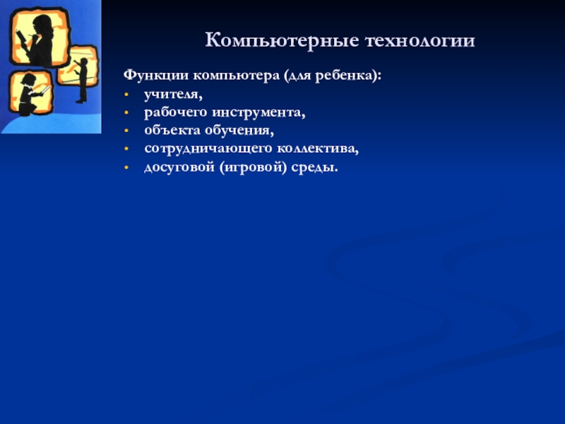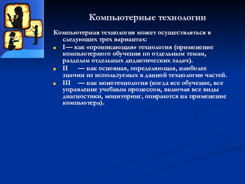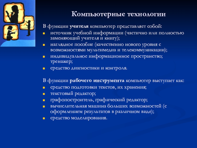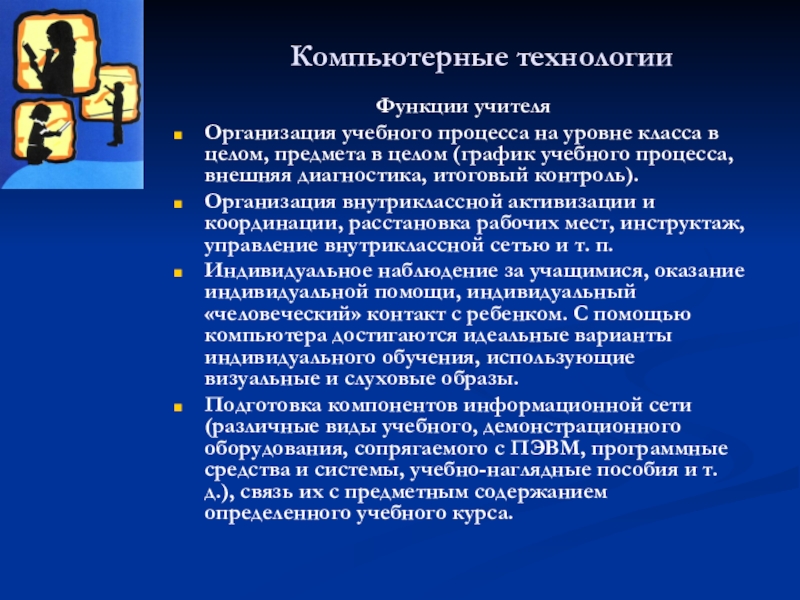 Индивидуальное наблюдение за учащимися, оказание индивидуальной помощи, индивидуальный «человеческий» контакт с ребенком. С помощью компьютера достигаются идеальные варианты индивидуального обучения, использующие визуальные и слуховые образы.