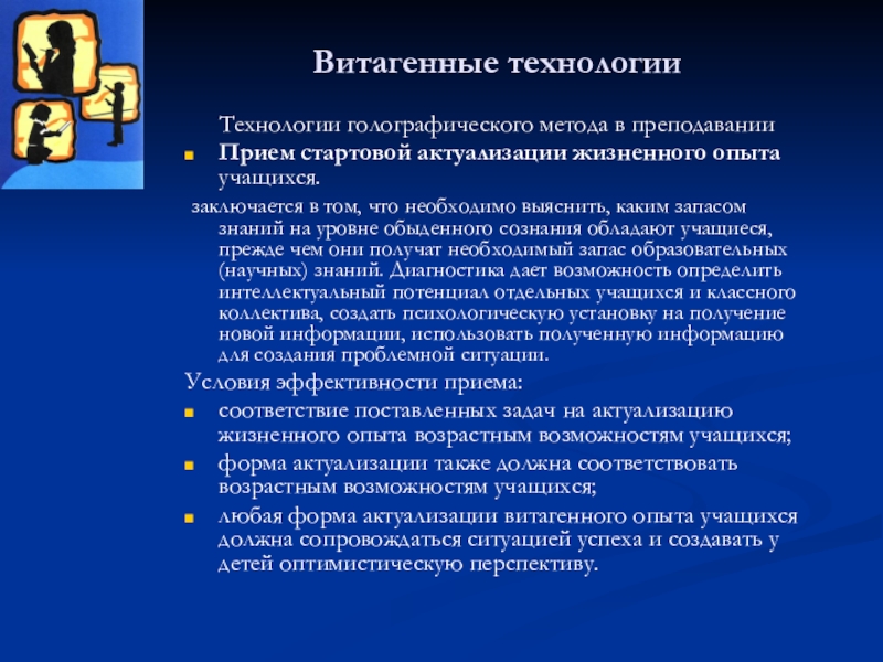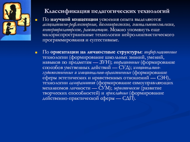 По научной концепции усвоения опыта выделяются: ассоциативно-рефлекторные, бихевиористские, гештальттехнологии,