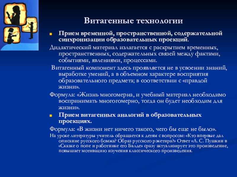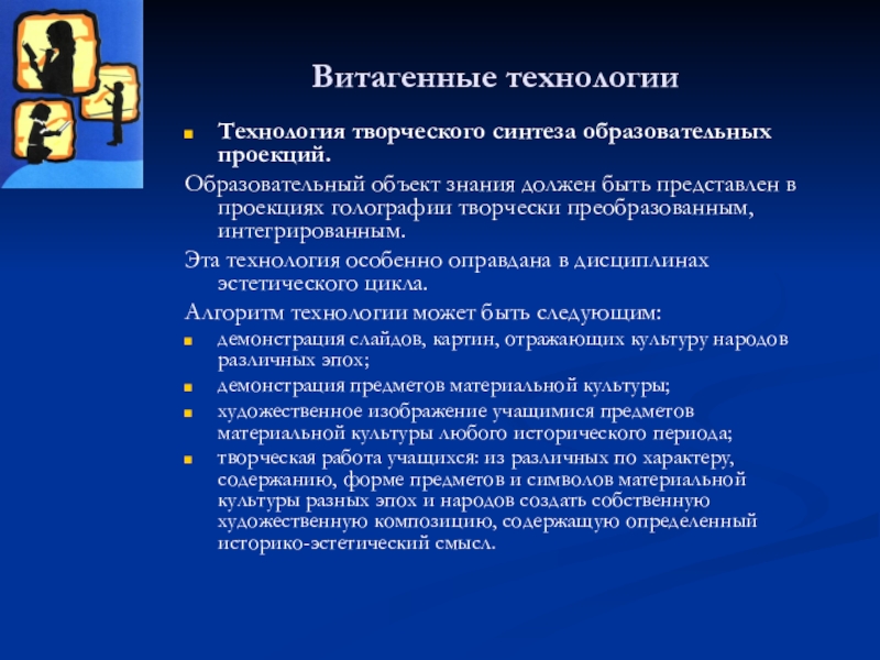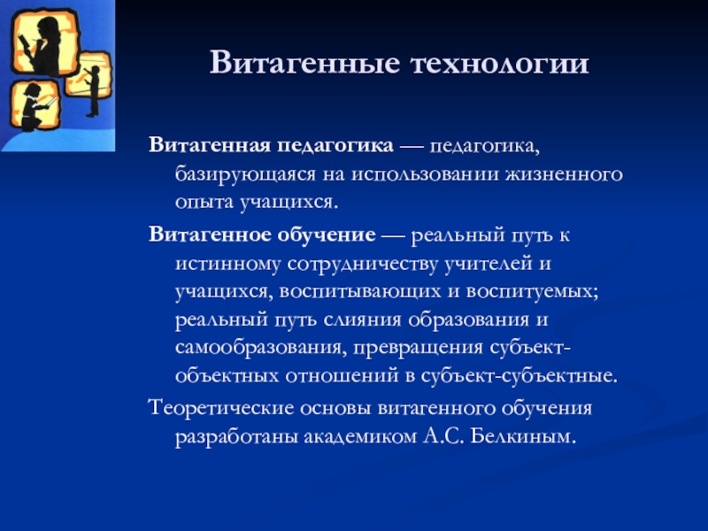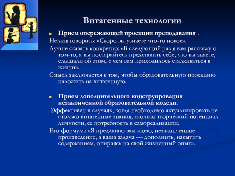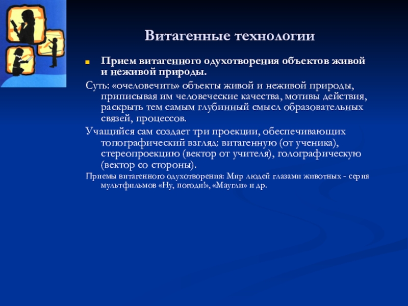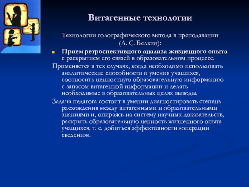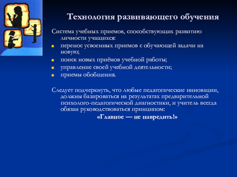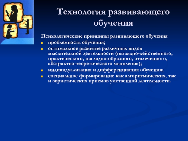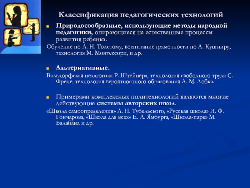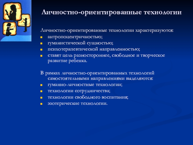 интериоризаторские, развивающие. Можно упомянуть еще малораспространенные технологии нейролингвистического программирования и суггестивные.