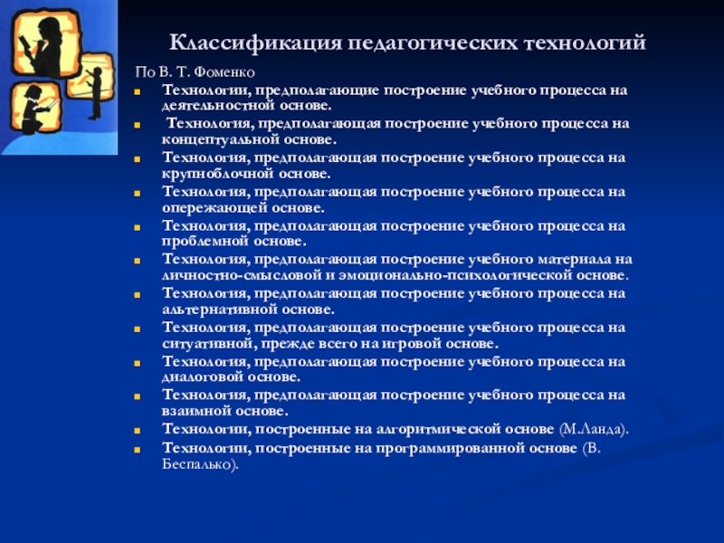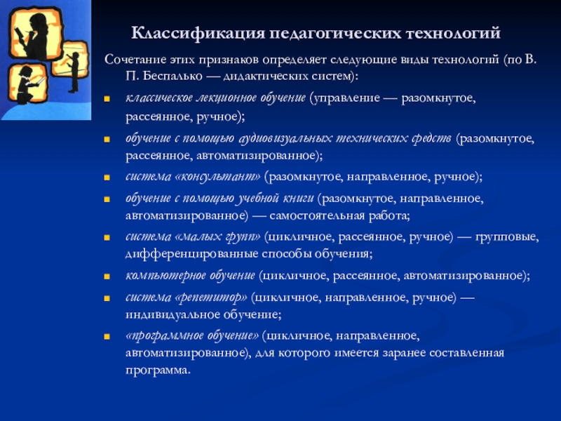 Сочетание этих признаков определяет следующие виды технологий (по В.