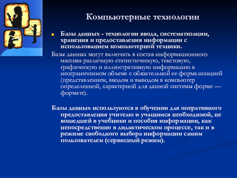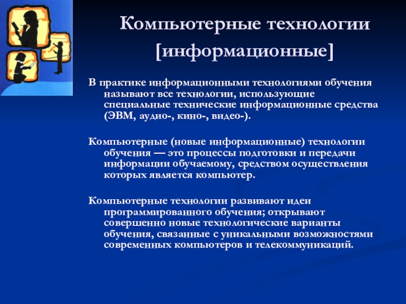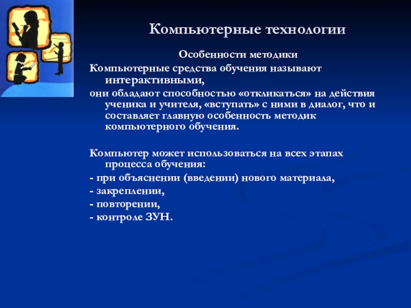 на действия ученика и учителя, «вступать» с ними в диалог, что и составляет главную особенность методик компьютерного обучения.
