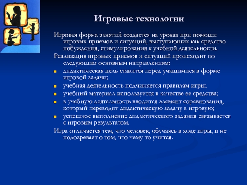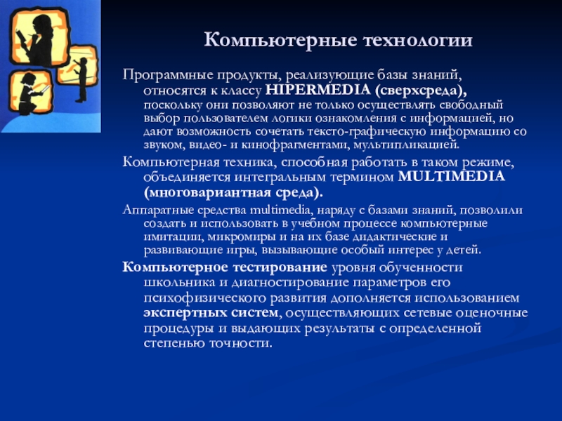 Аппаратные средства multimedia, наряду с базами знаний, позволили создать и использовать в учебном процессе компьютерные имитации, микромиры и на их базе дидактические и развивающие игры, вызывающие особый интерес у детей.