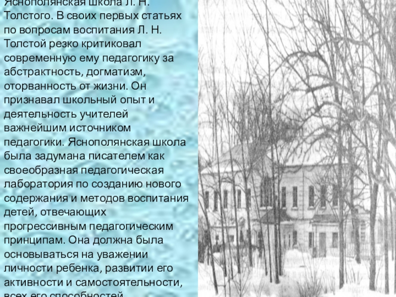 Слайд 11Яснополянская школа Л. Н. Толстого. В своих первых статьях по вопросам