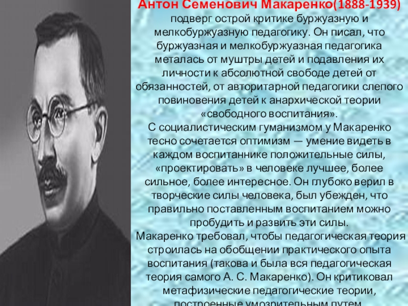 Слайд 22Антон Семенович Макаренко(1888-1939) подверг острой критике буржуазную и мелкобуржуазную педагогику. Он