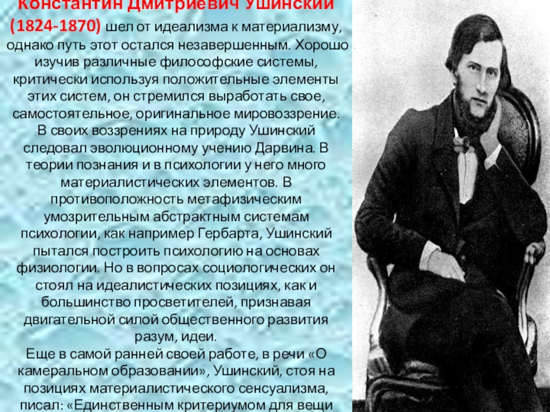Слайд 5Константин Дмитриевич Ушинский(1824-1870) шел от идеализма к материализму, однако путь этот