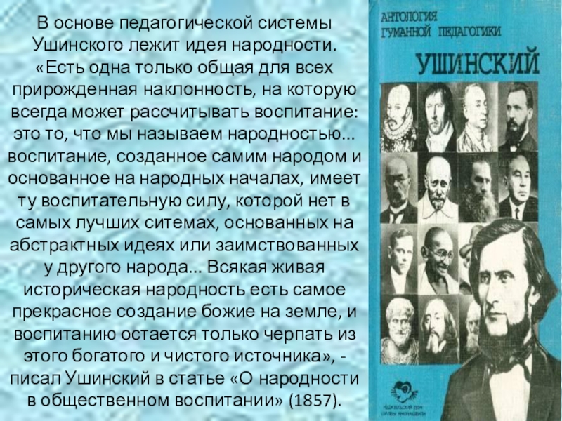 общая для всех прирожденная наклонность, на которую всегда может рассчитывать воспитание: это то, что мы называем народностью... воспитание, созданное самим народом и основанное на народных началах, имеет ту воспитательную силу, которой нет в самых лучших ситемах, основанных на абстрактных идеях или заимствованных у другого народа... Всякая живая историческая народность есть самое прекрасное создание божие на земле, и воспитанию остается только черпать из этого богатого и чистого источника», - писал Ушинский в статье «О народности в общественном воспитании» (1857).