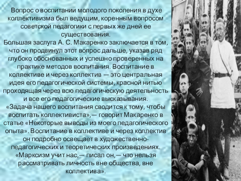 Большая заслуга А. С. Макаренко заключается в том, что он продвинул этот вопрос дальше, указав ряд глубоко обоснованных и успешно проверенных на практике методов воспитания. Воспитание в коллективе и через коллектив — это центральная идея его педагогической системы, красной нитью проходящая через всю педагогическую деятельность и все его педагогические высказывания.