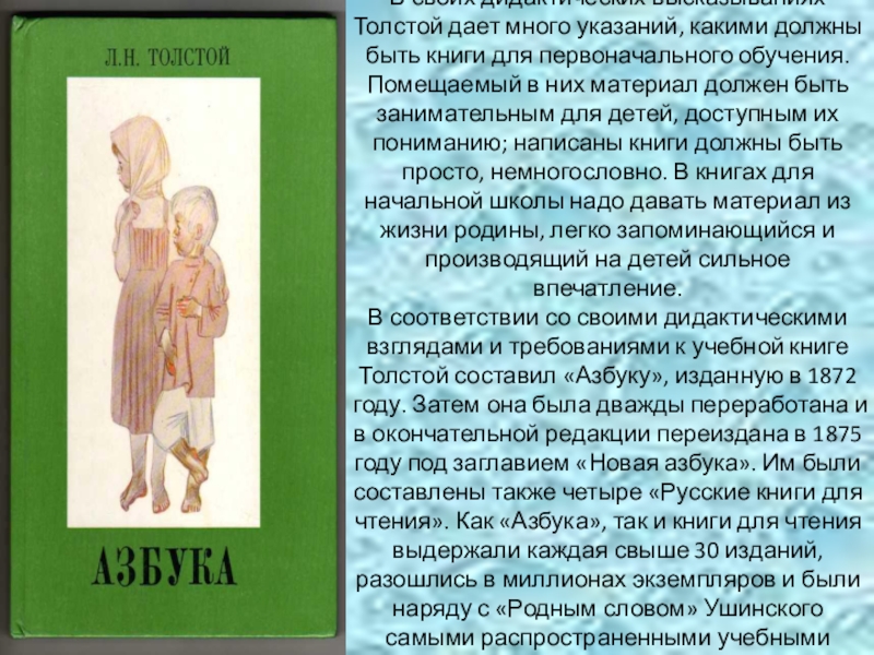 В соответствии со своими дидактическими взглядами и требованиями к учебной книге Толстой составил «Азбуку», изданную в 1872 году. Затем она была дважды переработана и в окончательной редакции переиздана в 1875 году под заглавием «Новая азбука». Им были составлены также четыре «Русские книги для чтения». Как «Азбука», так и книги для чтения выдержали каждая свыше 30 изданий, разошлись в миллионах экземпляров и были наряду с «Родным словом» Ушинского самыми распространенными учебными книгами в земских начальных школах.