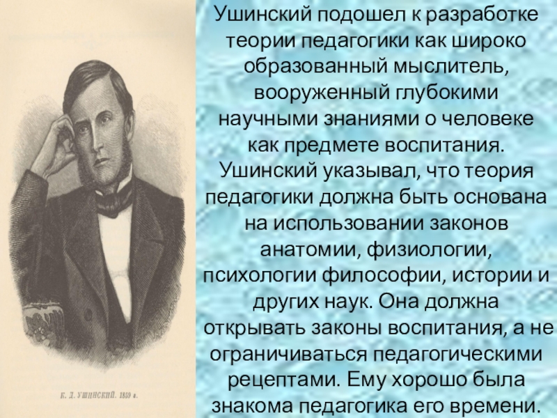 глубокими научными знаниями о человеке как предмете воспитания. Ушинский указывал, что теория педагогики должна быть основана на использовании законов анатомии, физиологии, психологии философии, истории и других наук. Она должна открывать законы воспитания, а не ограничиваться педагогическими рецептами. Ему хорошо была знакома педагогика его времени.