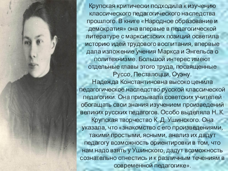 Надежда Константиновна высоко ценила педагогическое наследство русской классической педагогики. Она призывала советских учителей обогащать свои знания изучением произведений великих русских педагогов. Особо выделяла Н. К. Крупская творчество К. Д. Ушинского. Она указала, что «знакомство с его произведениями, такими простыми, ясными, анализ их дадут педагогу возможность ориентировки в том, что нам надо взять у Ушинского, дадут возможность сознательно отнестись и к различным течениям в современной педагогике».