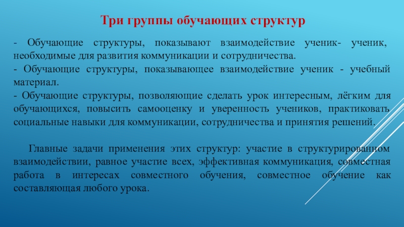 - Обучающие структуры, показывают взаимодействие ученик- ученик, необходимые