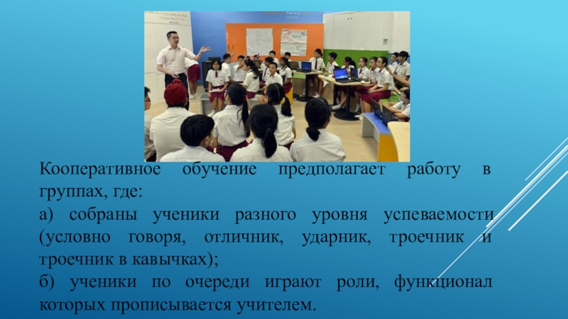 Слайд 4Кооперативное обучение предполагает работу в группах, где: