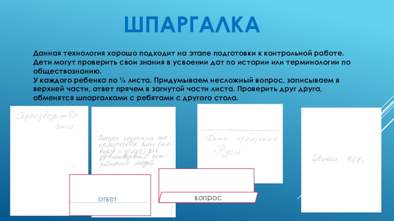 У каждого ребенка по ¼ листа. Придумываем несложный вопрос, записываем в верхней части, ответ прячем в загнутой части листа. Проверить друг друга, обменятся шпаргалками с ребятами с другого стола.