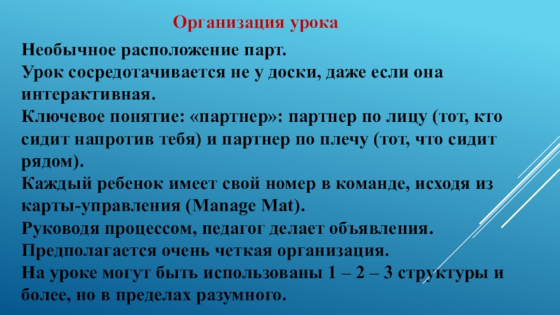 Парты должны отходить лучами от учительского стола, чтобы никто не сидел спиной к учителю. Учитель, ведя урок, делает объявления: «Внимание! Говорят партнеры по плечу», «А теперь послушаем мнение партнеров по лицу». Каждый ребенок имеет свой номер в команде.