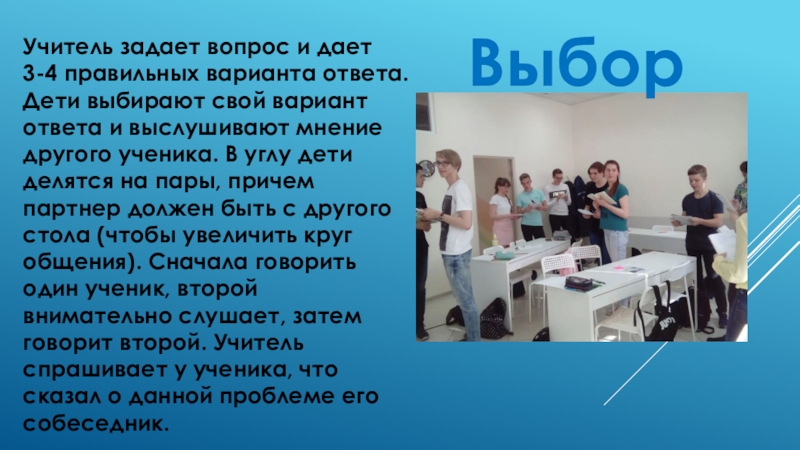 выбирают свой вариант ответа и выслушивают мнение другого ученика. В углу дети делятся на пары, причем партнер должен быть с другого стола (чтобы увеличить круг общения). Сначала говорить один ученик, второй внимательно слушает, затем говорит второй. Учитель спрашивает у ученика, что сказал о данной проблеме его собеседник.