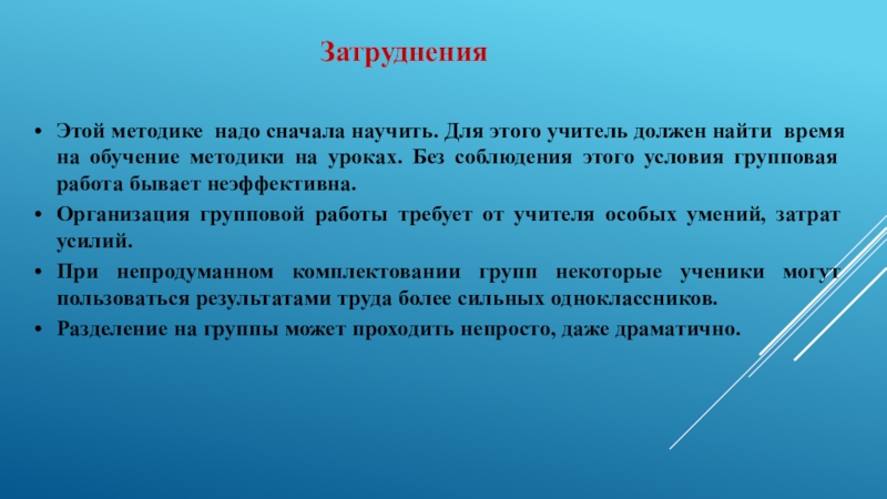 на обучение методики на уроках. Без соблюдения этого условия групповая работа бывает неэффективна.