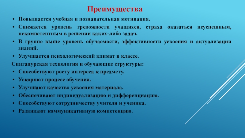- Обучающие структуры, позволяющие сделать урок интересным, лёгким для обучающихся, повысить самооценку и уверенность учеников, практиковать социальные навыки для коммуникации, сотрудничества и принятия решений.