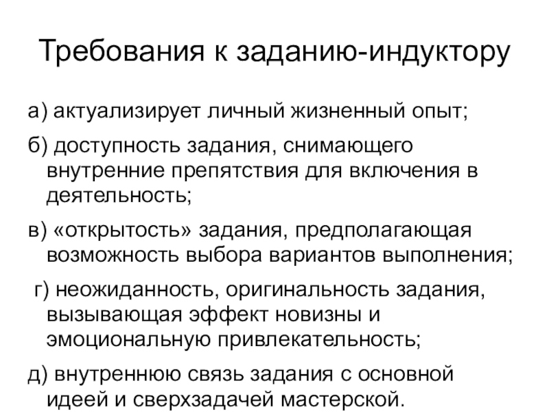 д) внутреннюю связь задания с основной идеей и сверхзадачей мастерской.