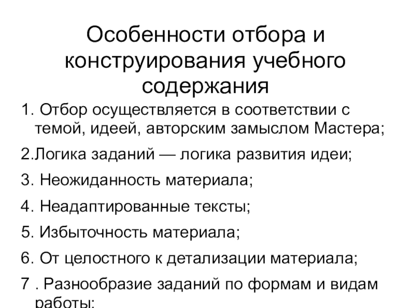Слайд 16Особенности отбора и конструирования учебного содержания