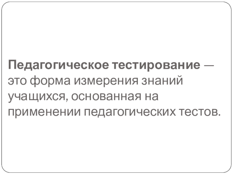 Слайд 6Педагогическое тестирование — это форма измерения знаний учащихся, основанная на применении педагогических