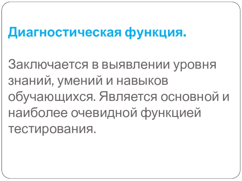 Слайд 11Диагностическая функция. Заключается в выявлении уровня знаний, умений и навыков обучающихся. Является
