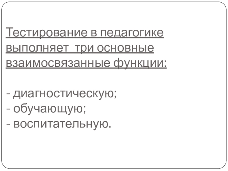 Слайд 10Тестирование в педагогике выполняет три основные взаимосвязанные функции: - диагностическую; - обучающую; - воспитательную.