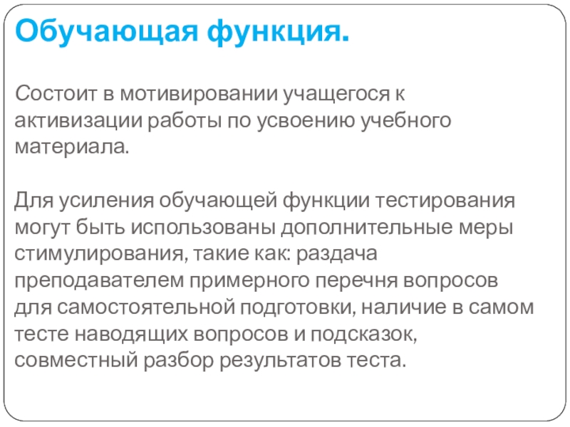 Слайд 13 Обучающая функция. Состоит в мотивировании учащегося к активизации работы по усвоению учебного