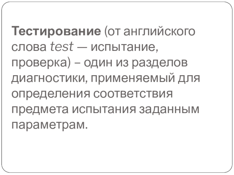Слайд 3Тестирование (от английского слова test — испытание, проверка) – один из разделов диагностики,