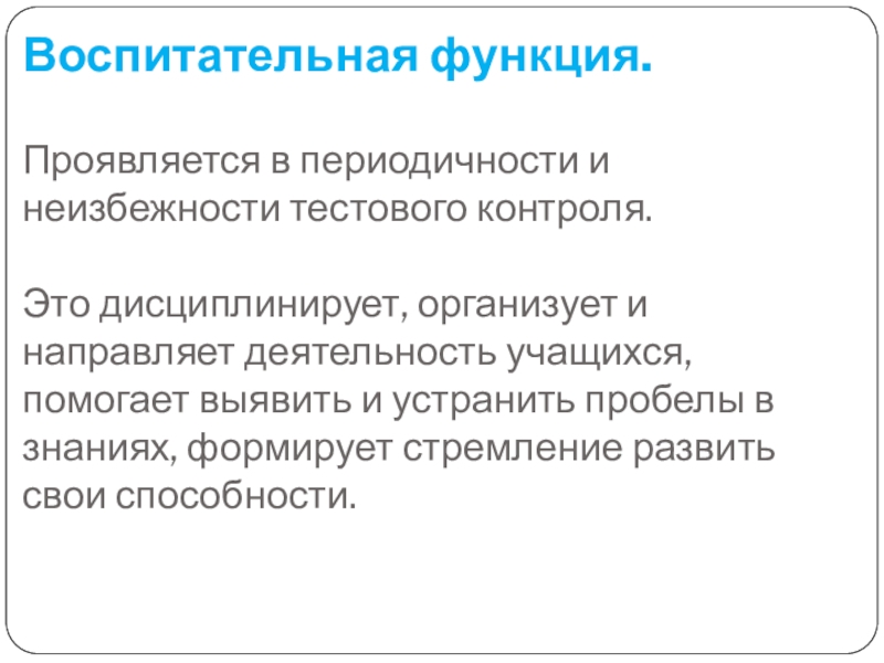 Слайд 15Воспитательная функция. Проявляется в периодичности и неизбежности тестового контроля. Это дисциплинирует, организует и