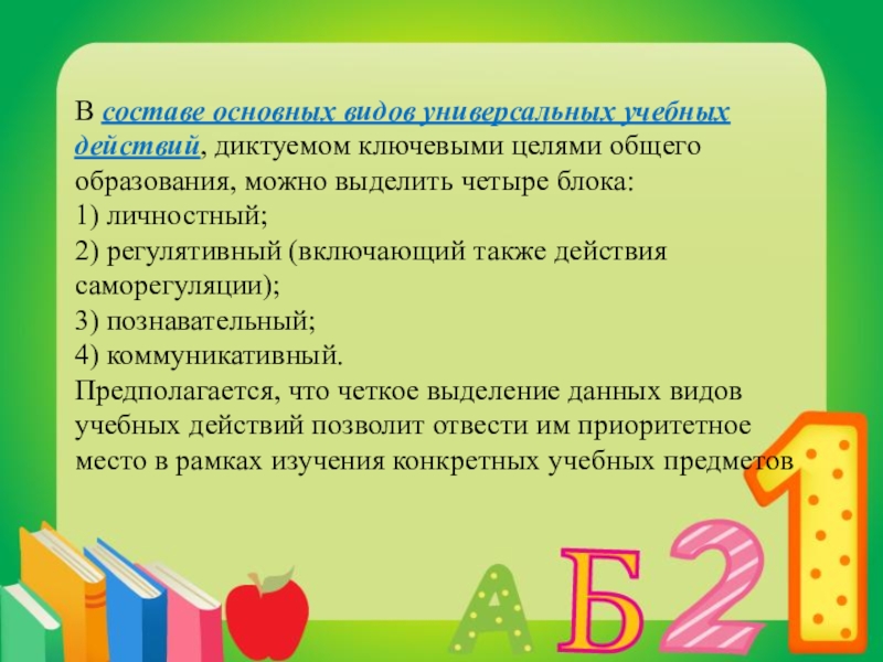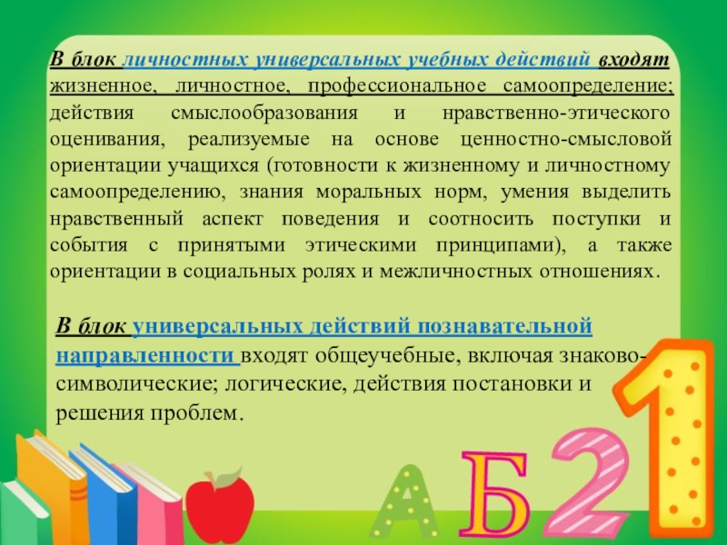 В блок универсальных действий познавательной направленности входят общеучебные, включая знаково-символические; логические, действия постановки и решения проблем.