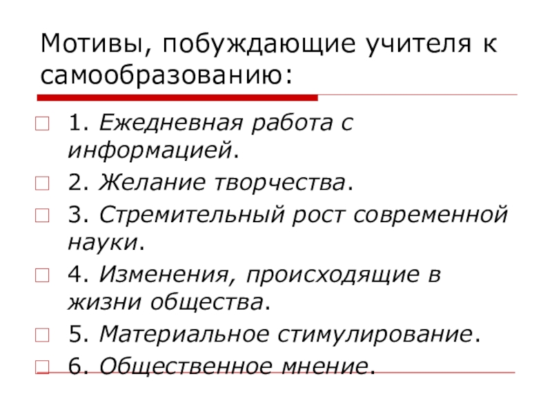 Слайд 4Мотивы, побуждающие учителя к самообразованию: