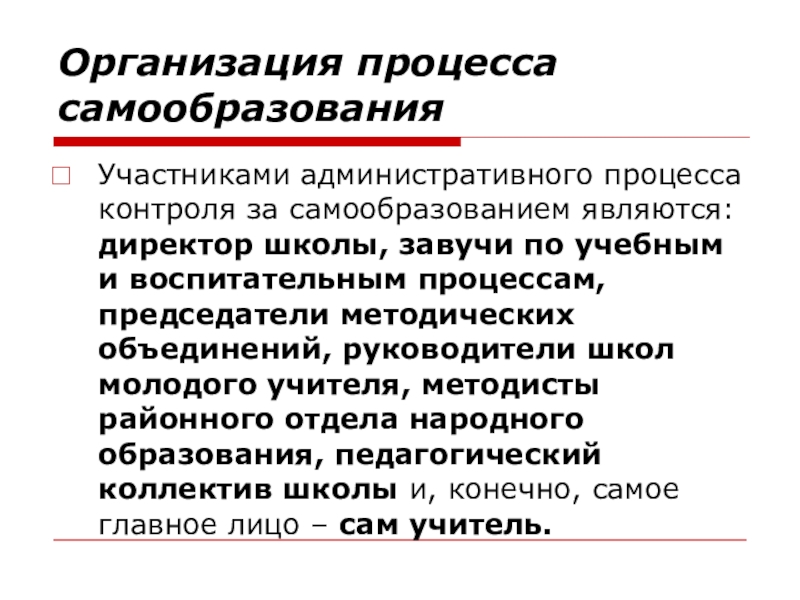 Участниками административного процесса контроля за самообразованием являются: директор школы,