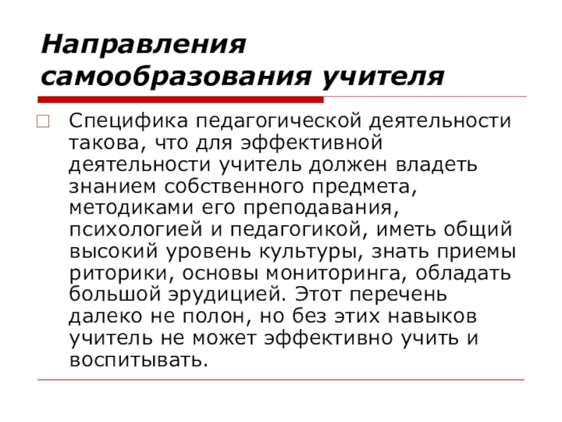 должен владеть знанием собственного предмета, методиками его преподавания, психологией и педагогикой, иметь общий высокий уровень культуры, знать приемы риторики, основы мониторинга, обладать большой эрудицией. Этот перечень далеко не полон, но без этих навыков учитель не может эффективно учить и воспитывать.