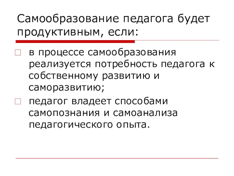 Слайд 10Самообразование педагога будет продуктивным, если: