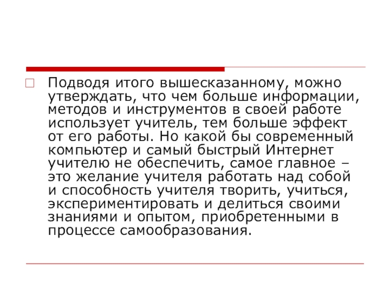 инструментов в своей работе использует учитель, тем больше эффект от его работы. Но какой бы современный компьютер и самый быстрый Интернет учителю не обеспечить, самое главное – это желание учителя работать над собой и способность учителя творить, учиться, экспериментировать и делиться своими знаниями и опытом, приобретенными в процессе самообразования.