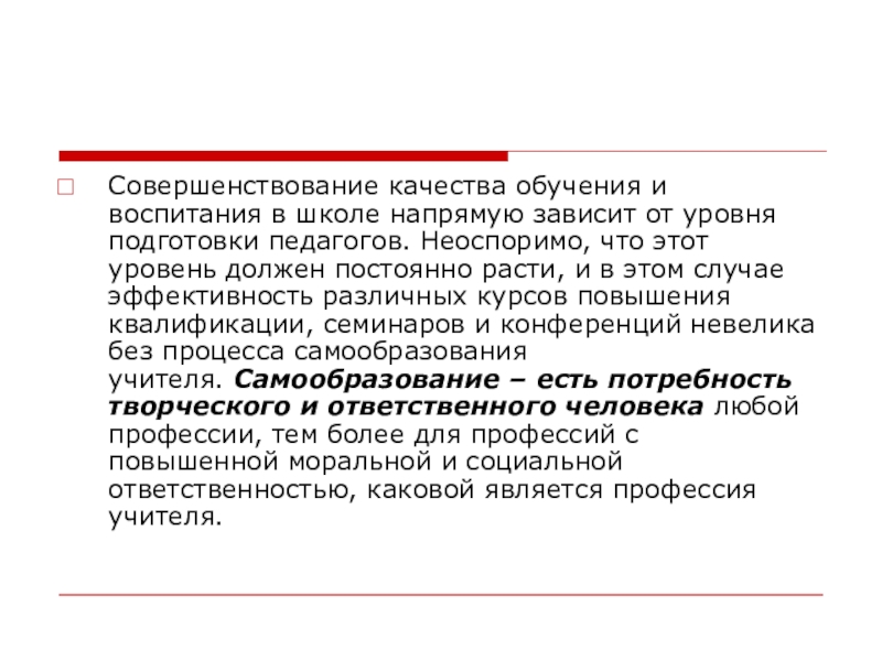 подготовки педагогов. Неоспоримо, что этот уровень должен постоянно расти, и в этом случае эффективность различных курсов повышения квалификации, семинаров и конференций невелика без процесса самообразования учителя. Самообразование – есть потребность творческого и ответственного человека любой профессии, тем более для профессий с повышенной моральной и социальной ответственностью, каковой является профессия учителя.