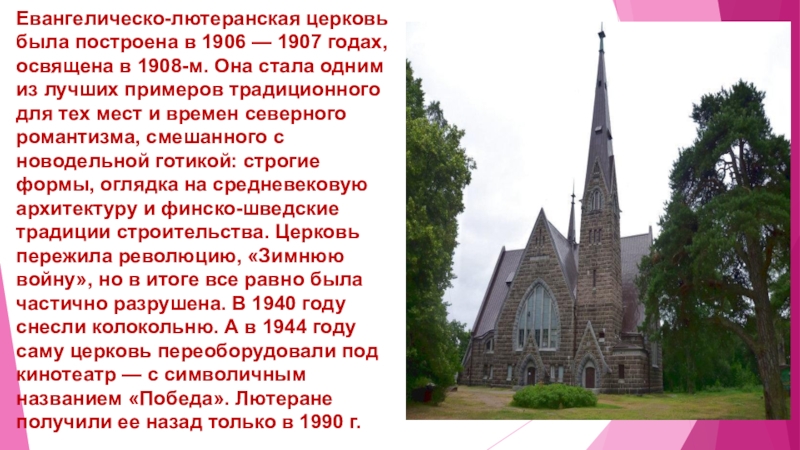 Она стала одним из лучших примеров традиционного для тех мест и времен северного романтизма, смешанного с новодельной готикой: строгие формы, оглядка на средневековую архитектуру и финско-шведские традиции строительства. Церковь пережила революцию, «Зимнюю войну», но в итоге все равно была частично разрушена. В 1940 году снесли колокольню. А в 1944 году саму церковь переоборудовали под кинотеатр — с символичным названием «Победа». Лютеране получили ее назад только в 1990 г.